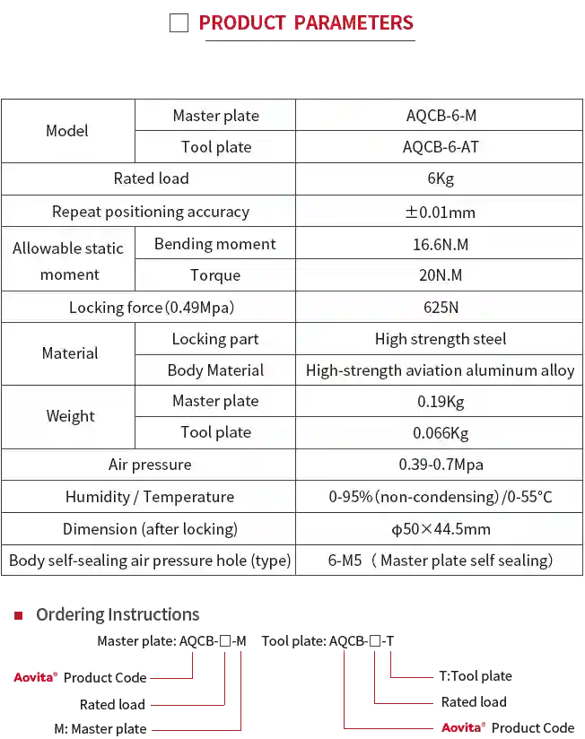 The quick-change function module provides access to media such as electricity, communications, compressed air, and hydraulic pressure for the robot execution tool, enabling simultaneous connection of supporting media when the main part of the quick-change is quickly connected.The following are the adaptation modules for AQC-6 robot tool quick change products: